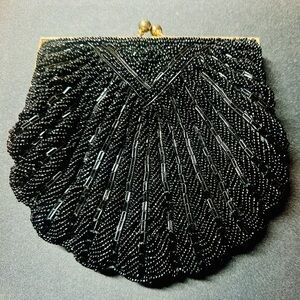 Design: Elegant clamshell/scalloped silhouette featuring intricate hand-beaded rows of black seed beads and faceted bugle beads.