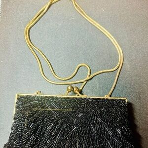 VTG Blk Beaded Clamshell Clutch Evening Bag Gold Metal Chain Scalloped Art Deco