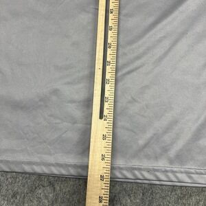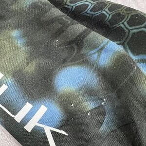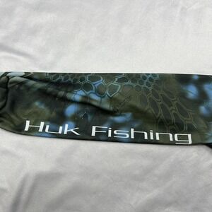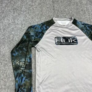 Tag says M. Pre-owned Huk mens long sleeve performance fishing t-shirt in gray polyester with blue and green camo sleeves shows light overall wear and mild wrinkling from prior use and storage. There are several small white thread pillsing / minor surface pulls on one sleeve near the Huk Fishing logo as shown in the close-up photos. Fabric, seams, hems, and printed graphics are otherwise clean and intact without holes or tears, interior printed label remains legible, and shirt is stored folded in a clear protective polybag in a climate controlled environment until shipment; see photos for close-up views.