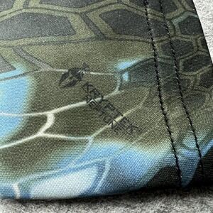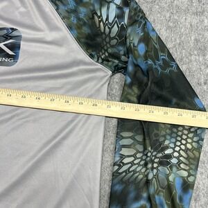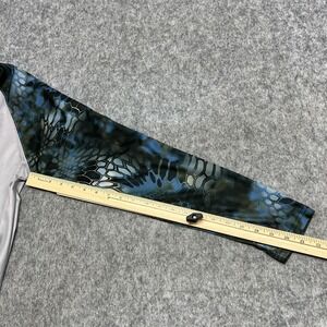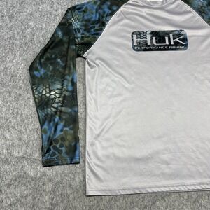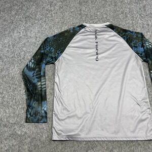 Tag says M. Huk mens long sleeve performance fishing t-shirt in gray lightweight polyester jersey fabric with blue and green camo raglan sleeves suitable for fishing, boating, and active outdoor wear; see photos for close-up views.