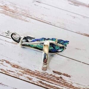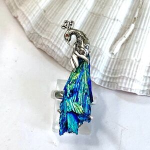 NWT Artist designed peacock ring with vibrant Rainbow Aura Kyanite. Hand crafted solid sterling silver with tooled details, and a Garnet gem eye. A great piece of wearable art.