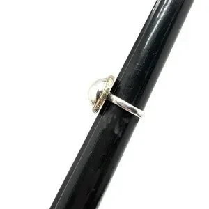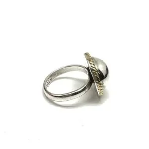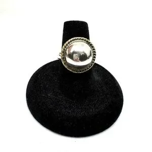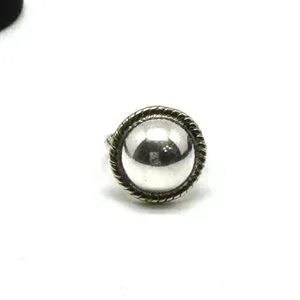 This is a vintage Taxco, half sphere/dome shaped sterling silver ring with a contrasting brass decorative rope trim border.