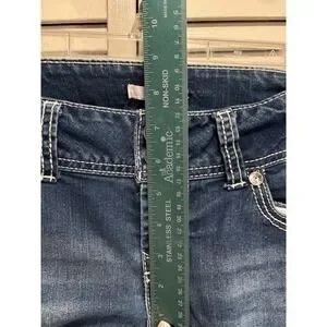 The Bongo Skinny Crochet Sequins Med Wash Denim Jeans in size 7 are a stylish and trendy choice for women looking for a low-rise fit. It has a measured rise of 7.5", 28" waist and 28" inseam. These jeans feature a 5-pocket design with a zip and button closure, making them both functional and fashionable. The embroidered sequin accents add a touch of sparkle to the solid blue denim fabric, while the stretch and breathable features ensure comfort throughout the day. Perfect for any season, these jeans are a versatile addition to any wardrobe, adding a touch of 90s flair with their USA-themed design.