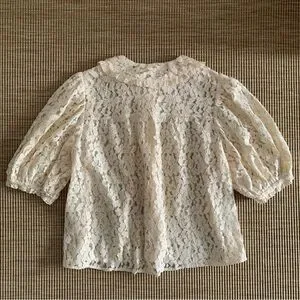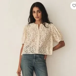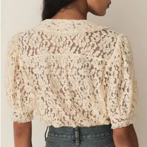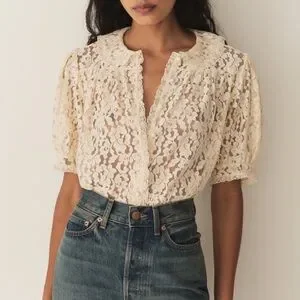 In intricate allover floral lace, the ‘30s-inspired Lenore Top features a Peter Pan collar trimmed with scallop-edged lace, short puffed sleeves, and a breezy cut. Satin-covered buttons extend down the front.