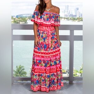 Bright red and pink off-shoulder maxi dress with vibrant floral print. Elasticized neckline for a comfortable off-shoulder fit. Elastic waistline defines the silhouette for a flattering look. Lightweight, flowy fabric ideal for warm-weather outings. No belt. Belt not included.