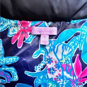 Sleek black quilted puffer vest with floral liner from Lilly Pulitzer. High stand collar for added coverage. Full-length front zipper for easy wear. Two zip pockets secure small items. Lightweight insulated silhouette for layering.