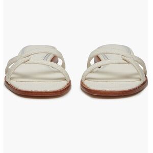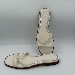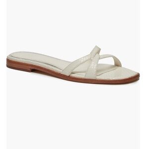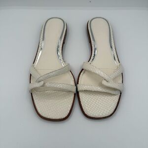The PAIGE Toby Snake-Embossed Leather Slide Sandals in women's size 7 are a stylish and versatile choice for summer footwear. Made from ivory leather with a snake-embossed design, these sandals feature a comfortable flat style perfect for everyday wear. The Paige brand is known for quality and attention to detail, making these sandals a fashionable and durable addition to any woman's shoe collection.