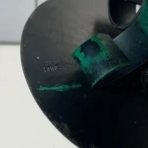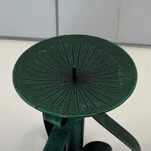 Vintage wrought iron pillar candle holder features a striking green verdigris finish over a black base. Designed with elegant scrollwork legs and a sunburst-etched top plate, this piece includes a central spike to secure your candle. The tripod base provides stability while the weathered patina adds a touch of rustic or gothic charm to any mantle or tabletop. Stamped 'Made in Hong Kong' on the underside.