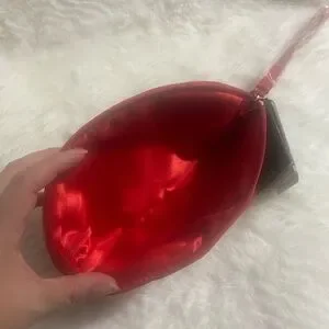 Sleek Giorgio Armani cosmetic pouch in vivid red. Features a gold circular logo on front. Rounded silhouette with glossy trim. Suitable for organizing makeup and small essentials.
