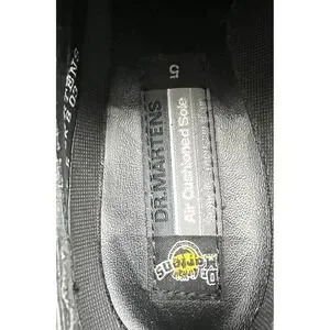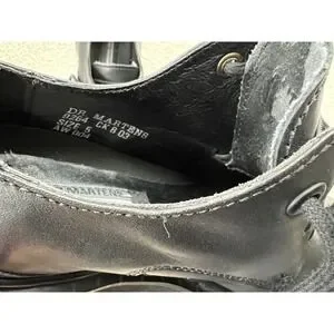 Dr. Martens black leather low-top oxford shoes with air-cushioned sole. These classic lace-up shoes feature a durable construction and signature platform sole. The interior displays the Dr. Martens branding and size.