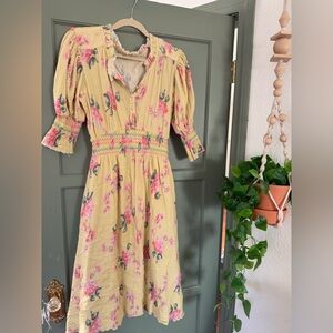 Romantic midi dress by LoveShackFancy in a soft yellow base with pink floral motifs. Smocked waist defines the silhouette. Puff sleeves and button-front add vintage charm. Lightweight, airy fabric for warm days.