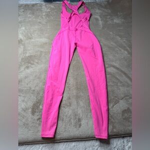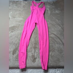 Vibrant neon pink one-piece jumpsuit with a racerback silhouette. Smooth, stretchy fabric provides a snug, supportive fit for workouts or everyday wear. Breathable material moves with you for comfort and confidence. Easy to style and brightens any active wardrobe.