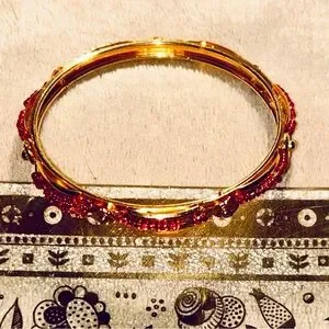 Shiny gold-tone bangle adorned with vibrant red bead detailing. Lightweight and comfortable for daily wear or dressy looks. Red accents add a bold pop of color to any outfit.