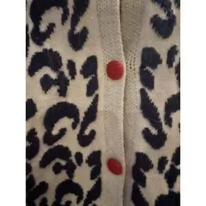 Eye-catching long sleeve cardigan with bright red buttons and taupe navy blue leopard pattern