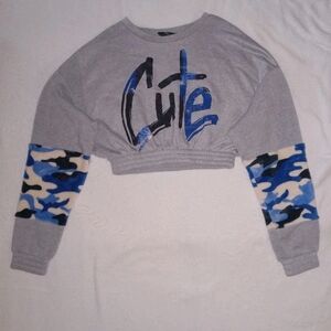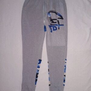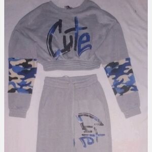 New without tags. Comfortable grey track pants and cropped sweatshirt set with blue camo sleeve panels. Elastic drawstring waist and relaxed jogger silhouette for easy wear. Subtle blue graphic details add a playful, coordinated touch.
