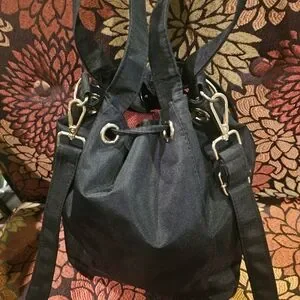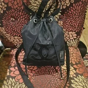 Elegant black drawstring bag by CHANEL. Soft fabric construction with signature CC logo detail. Adjustable shoulder straps and secure drawstring closure. Sleek black finish ideal for everyday style.