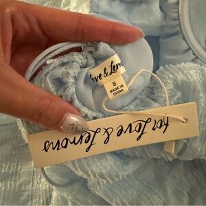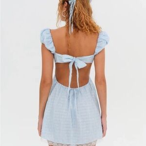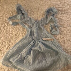 Playful pale blue mini dress with delicate lace trim. Puff sleeves and a tie-front bodice create a flirty look. Light, airy fabric with a soft, feminine silhouette.