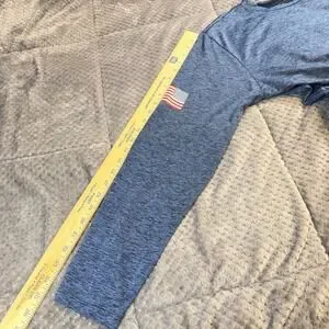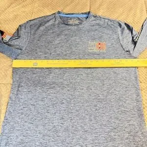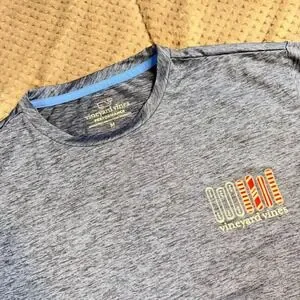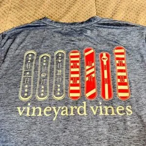 Vineyard Vines Performance long sleeve shirt in a blue heathered finish. This technical top features a moisture-wicking polyester-spandex blend, perfect for active wear or casual layering. The design includes a patriotic snowboard graphic on the back and chest, an American flag patch on the right sleeve, and the brand name printed along the left sleeve. Lightweight and breathable with a comfortable crew neckline.