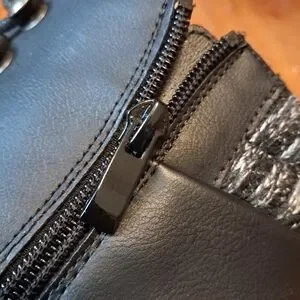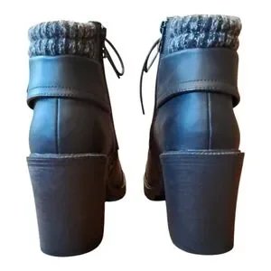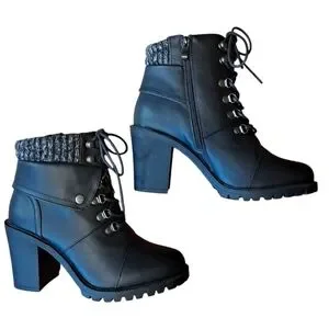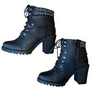 Stylish, comfy, and built for fall weather These Torrid hiker-style booties feature a sturdy chunky heel and lug sole for extra grip and edge. The knitted sweater cuff adds a cozy twist — perfect for pairing with leggings, jeans, denim jackets, or flannel dresses!