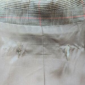 Flaws-see pics for pinhole snags and holes on pants and blazer shoulder, and a small rip on the rear on pants.
