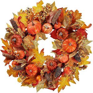[HIGH QUALITY WREATH]: This artificial fall wreath is made of large size pumpkins,autumn leaves,pine cones and colorful berries full of rich texture. The base is made of durable grapevine and clusters of berries. The entirely realistic wreath is vivid and vibrant.