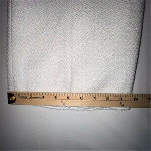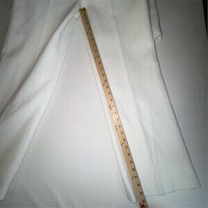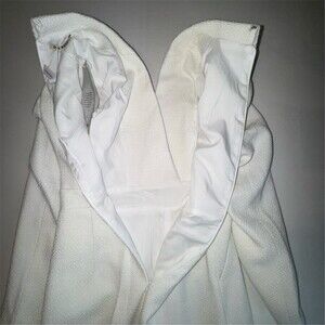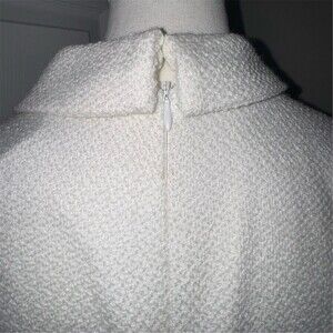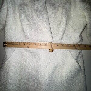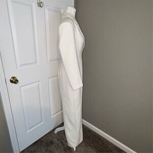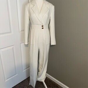 FEHAUTE women’s one-piece jumpsuit in white tweed made from a polyester and wool blend. Size 4 regular with a classic fit and 29 in inseam. Long set-in sleeves with a collared notched lapel neckline and wide-leg silhouette. Gold-tone button accents with buckle pocket stitching, functional pockets, and a back zip closure. Suitable for party/cocktail events, weddings, and other formal occasions.