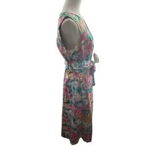 This dress is a pullover, v neck, closure of a back hook and eye at the neck. Bodice is self lined, the rest of the dress is lined in a white material. Pockets, sleeveless. The dress has an attached waist belt/for tying in a bow or a knot. Tea Length. Perfect for spring, summer, fall, garden parties, bridal, weddings. Artsy boho chic cottage coastal southern dress
