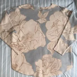 Soft crewneck sweater with large floral jacquard print. Lightweight knit and relaxed fit. Dolman sleeves for easy movement. Pastel tones for a feminine look. Pairs well with jeans or skirts.