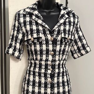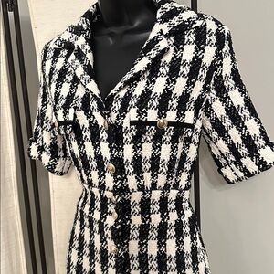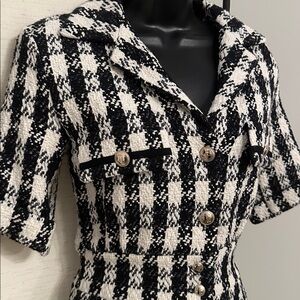 Purchased from Bloomingdale’s this is from designer brand Maje. Material is nice and thick with beautiful tweed in black and white. Size France 36 or Maje size 1 or small. Wear with a cami and boots.