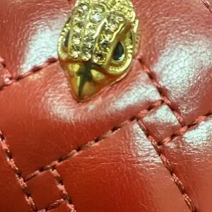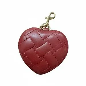 Quilted heart-shaped keychain in red leather. Features gold-tone chain, clip, and decorative emblem. Attaches easily to keys or bags for a chic accent. Even though the item is new, it has a small mark. See last photo.
