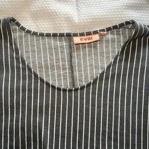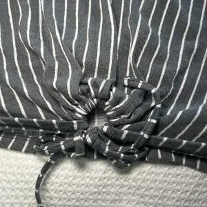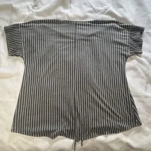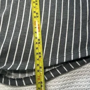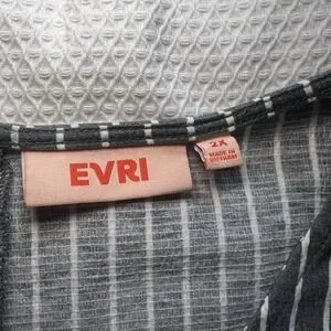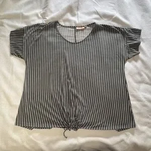 The Evri Women's Plus Size Striped Tie-Front Short Sleeve Top in size 2X is a flowy and oversized blouse perfect for casual occasions in the summer, fall, and spring seasons. The top features a round neckline, short sleeves, and a tie closure detail. Made of a blend of polyester, spandex, and rayon in a stylish gray color, this blouse from the brand Evri is machine washable for easy care. Perfect for women looking for a basic yet trendy addition to their wardrobe, this top offers comfort and style in a flattering plus size fit.