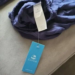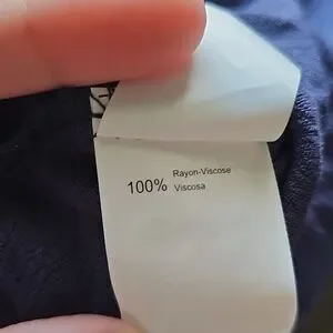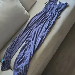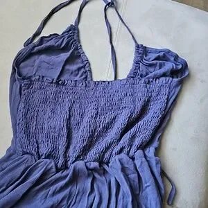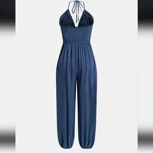 Halter neckline with gathered detail. Deep V front and relaxed wide legs. Elasticized ankle cuffs and side patch pockets. Lightweight, flowy fabric for beach or casual wear. New with tags 100% viscose material
