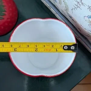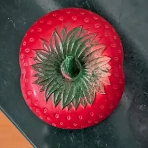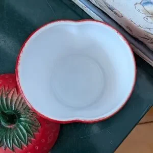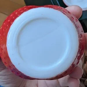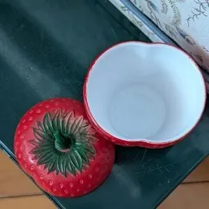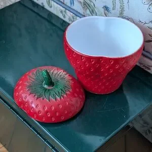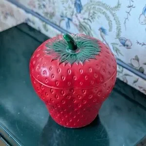 Adorable vintage milk glass jar made to look like a strawberry. it is in excellent condition with only some minor paint wear around the stem as pictured. no obvious chips or cracks.