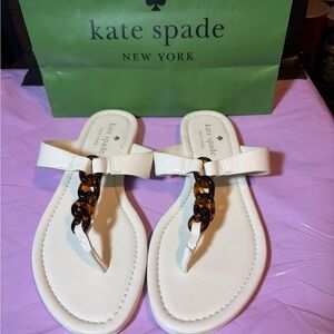 Stylish kate spade thong sandals. Smooth white leather upper with tortoiseshell chain detail. Easy slip-on design. Sleek, versatile look for warm weather wear. Kate spade ivory sandals new no box
