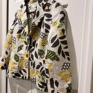 Crafted in a breathable natural-fiber blend, this jacket features a rich botanical floral print accented with whimsical bee motifs — a rare combination that feels both artistic and refined. The structured silhouette offers light tailoring without stiffness, making it ideal for gallery days, creative workspaces, travel, or elevated everyday wear.