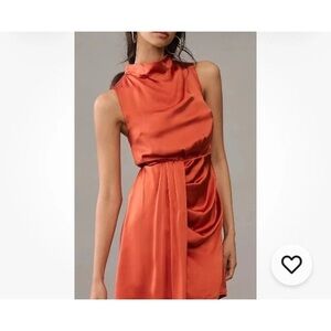 This Anthropologie Size 6 Mock-Neck Draped Silk Dress in Baked Paprika is a stylish and elegant option for any occasion. The dress features a sleeveless design with a mock neck neckline, making it a versatile choice for both formal events and casual outings. Made from luxurious silk material, this mini dress in a solid orange color adds a pop of vibrancy to your wardrobe. Perfect for a day out or a night on the town, this Anthropologie dress is sure to make a statement.
