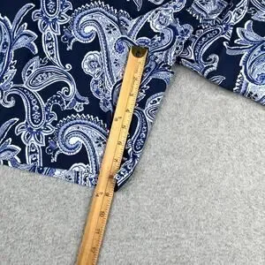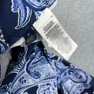 These Polo Ralph Lauren Paisley Shorts in men's size 38 are a stylish and comfortable addition to any casual wardrobe. Made from stretchy cotton material, these blue shorts feature a flat front, mid-rise waist, and a zip closure. With a classic chino style and a 9-inch inseam, they are perfect for the warmer seasons of summer and spring. The paisley pattern adds a touch of sophistication to these versatile shorts, making them a great choice for a variety of occasions. Perfect for a relaxed and trendy look.