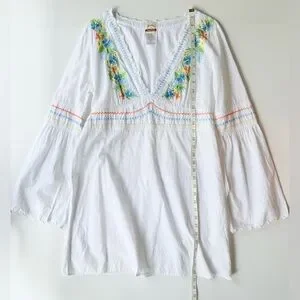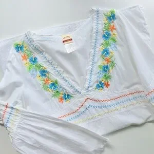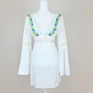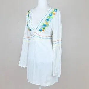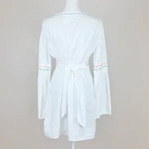 White v-neck long sleeve swim cover up dress by Tommy Bahama with a tie waist and tropical floral embroidery made from 100% cotton. Size M. Gently used.