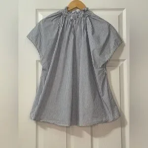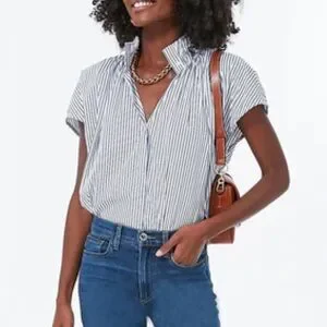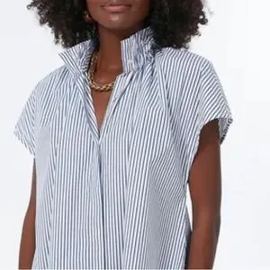 Effortlessly chic, the Rae Blouse takes everything we love about a classic button down and elevates it with fun, feminine details. Featuring a high neck ruffle collar, short cap sleeves, and a button front placket, this blue stripe shirt pairs well with denim and flats for daytime and gold jewelry for dining out with friends.