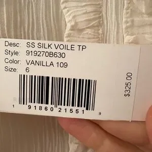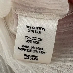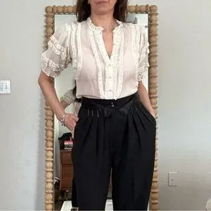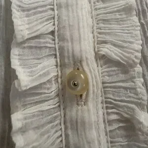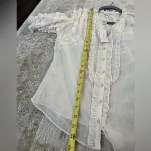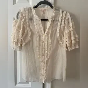 Soft ivory blouse with layered ruffle details. Lightweight, slightly sheer fabric. Short flutter sleeves with tiered ruffles. Button-front with delicate buttons. Romantic, feminine silhouette.