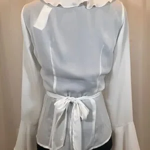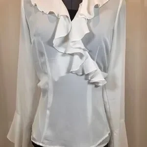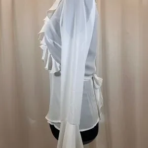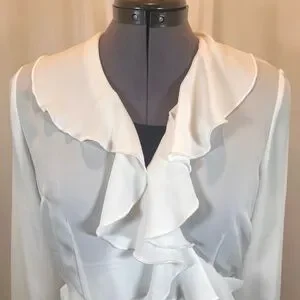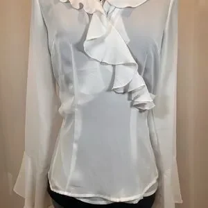 Lightweight white blouse with a cascading ruffle at the V-neck. Long sleeves with subtle flare at the cuffs. Smooth, flowy silhouette for polished looks. Simple, versatile design for work or events.