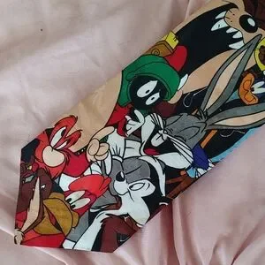 This is the only Looney Tunes tie that I have found that has every character imaginable on it.. Bugs Bunny, The Martian, Pepe Le Pew, Deputy Sam, Tasmanian Devil, Porky Pig, Sylvester, Roadrunner, and some whose names I don't even know! This tie is way way cool. Needs a little needle and thread work on the back (see the video) but that should be no problem. What's up doc!?