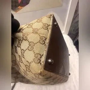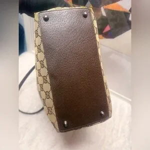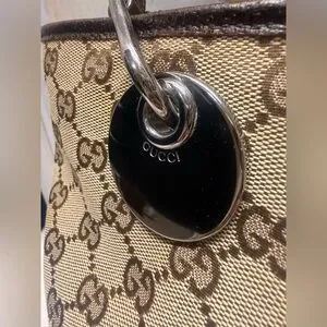 GUCCI-120836 002058 Beige Monogram Canvas Tote with Brown Leather Handle