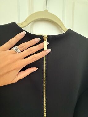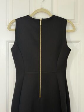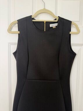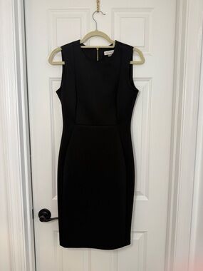 Classic Calvin Klein sheath dress in solid black. Sleeveless design with a streamlined fit. Simple round neckline and tailored seams for a flattering silhouette. Versatile piece for work or evening.