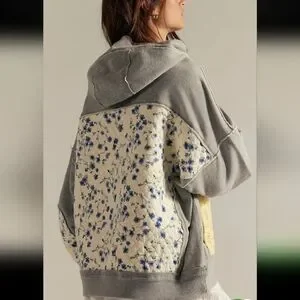 Stay cozy and stylish with this floral patchwork hoodie. Featuring a blend of gray and yellow, this top is perfect for casual outings. Enjoy the unique design and comfortable fit.