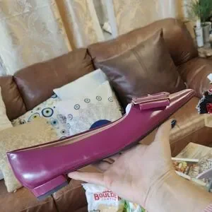 Polished magenta flats with a pointed toe and statement buckle. Smooth upper for a sleek look and easy slip-on wear. Low heel provides comfortable everyday style. Versatile magenta color pairs well with dresses or tailored looks.