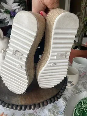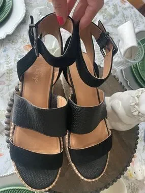 Crown Vintage platform sandals in black. Espadrille-wrapped wedge with textured straps. Buckle ankle strap for secure fit. Cushioned tan insole for comfort. Versatile summer style. The last photo is a stock photo, these shoes are like new!