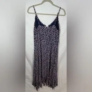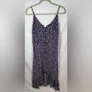 Beautiful Rails “Frida” floral midi dress in the Pink Poms print. Lightweight and flowy with delicate spaghetti straps and a flattering button-front design. Features a navy background with soft pink and white floral print and a feminine ruffle hem.