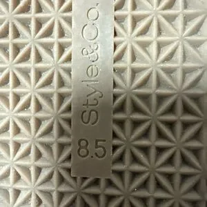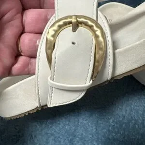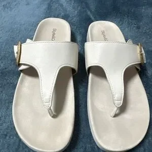 Chic cream toe-post sandals by Style & Co. Smooth upper with a gold buckle accent. Padded footbed for comfort. Easy slip-on style for everyday wear.