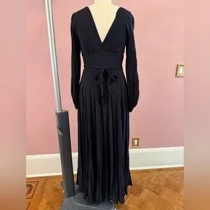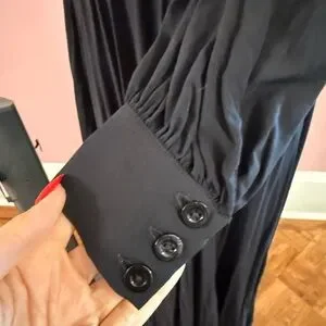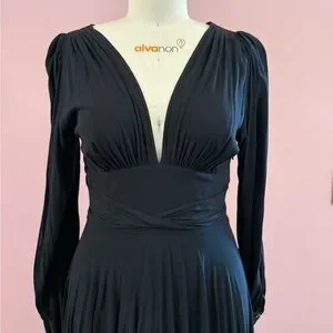 Trashy Diva stretch rayon maxi dress with a deep V-neck and long sleeves. Fitted waist with gentle gathers that lead to a flowing skirt. Sleek, draping fabric for elegant movement. Timeless black evening silhouette.